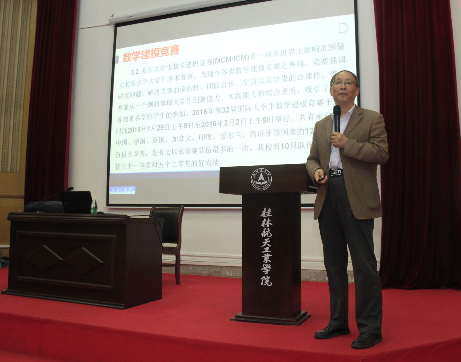 2016年4月19日晚上19:30,我校致远楼108教室座无虚席。理学部特别邀请了桂林电子科技大学数学建模总教练朱宁教授在此开展以“大学生如何将实际生活与数学建模相结合”为主题的讲座。本次讲座吸引了来自全校各院系的众多学生听众,以及广大数学建模爱好者。