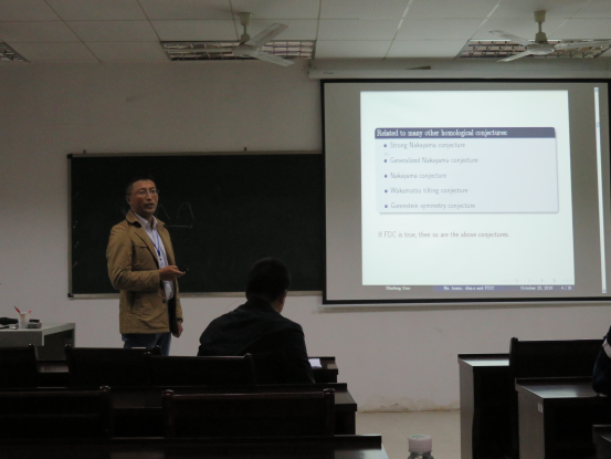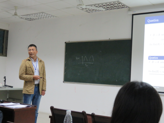 在本次会议中,我校理学部郭述锋博士还代表广西区做了题为《相对同调维数和有限维数猜想》专题学术报告。该报告获得了与会代表的一致肯定和认可,认为该研究结果体现了整个广西区在代数方向研究方面的最新前沿,同时也代表了广西区未来数学研究方面的风向标,具有较好的创新性和引领性。报告分享后,全体与会代表们还就湖南、湖北、广东、广西和海南等五省(区)数学研究现状、前沿课题等问题进行了热烈的分析与探讨。