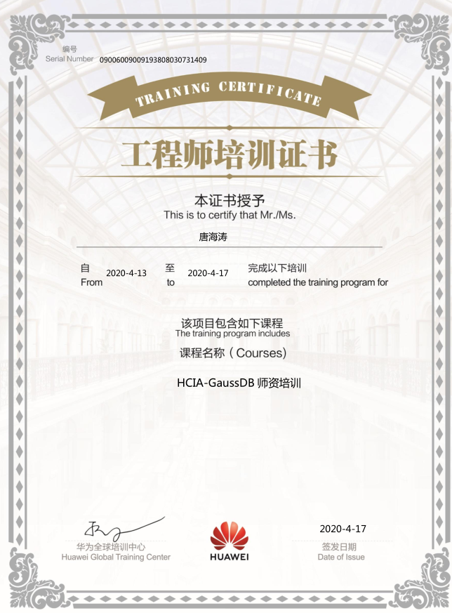 最后,经过为期5天全天线上培训,我院教师圆满完成了课程前期慕课、在线学习以及在线考试的各项任务,并取得了“HCIA-Gausss师资”的培训证书。