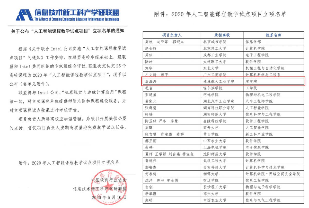 “人工智能课程教学试点项目”由信息技术新工科产学研联盟与Intel公司联合实施,旨在助力全国高校人工智能专业的课程建设与应用。bevictor伟德官网积极响应联盟号召并组织申报,最终经信息技术新工科产学研联盟与Intel公司专家组综合评议,共认定桂林航天工业学院、北京理工大学、南开大学等25所高校成功获得2020年人工智能课程教学试点项目立项。被列入“信息技术新工科产学研联盟人工智能课程教学试点项目”在获得教学研究经费同时,也支持我校参加此次课程教学试点的学生在通过课程测试后,可获得由联盟和Intel公司联合签发的课程结业证书。