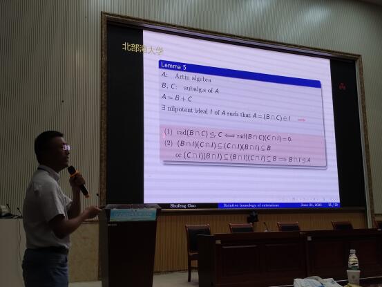 在本次会议中,我院郭述锋教授做了题为《由代数的满同态连接的扩张的相对同调》的分组学术报告,唐曦教授做了题为《加法范畴和高维微分加法范畴之间同调性质转换》的分组学术报告,重点介绍了扩张的相对同调维数理论,阐述了有限维代数和截断多项式代数在同调猜想,CM-有限(或自由)性,表示有限性等方面的相互关系,得到了与会专家学者的一致肯定和认可。