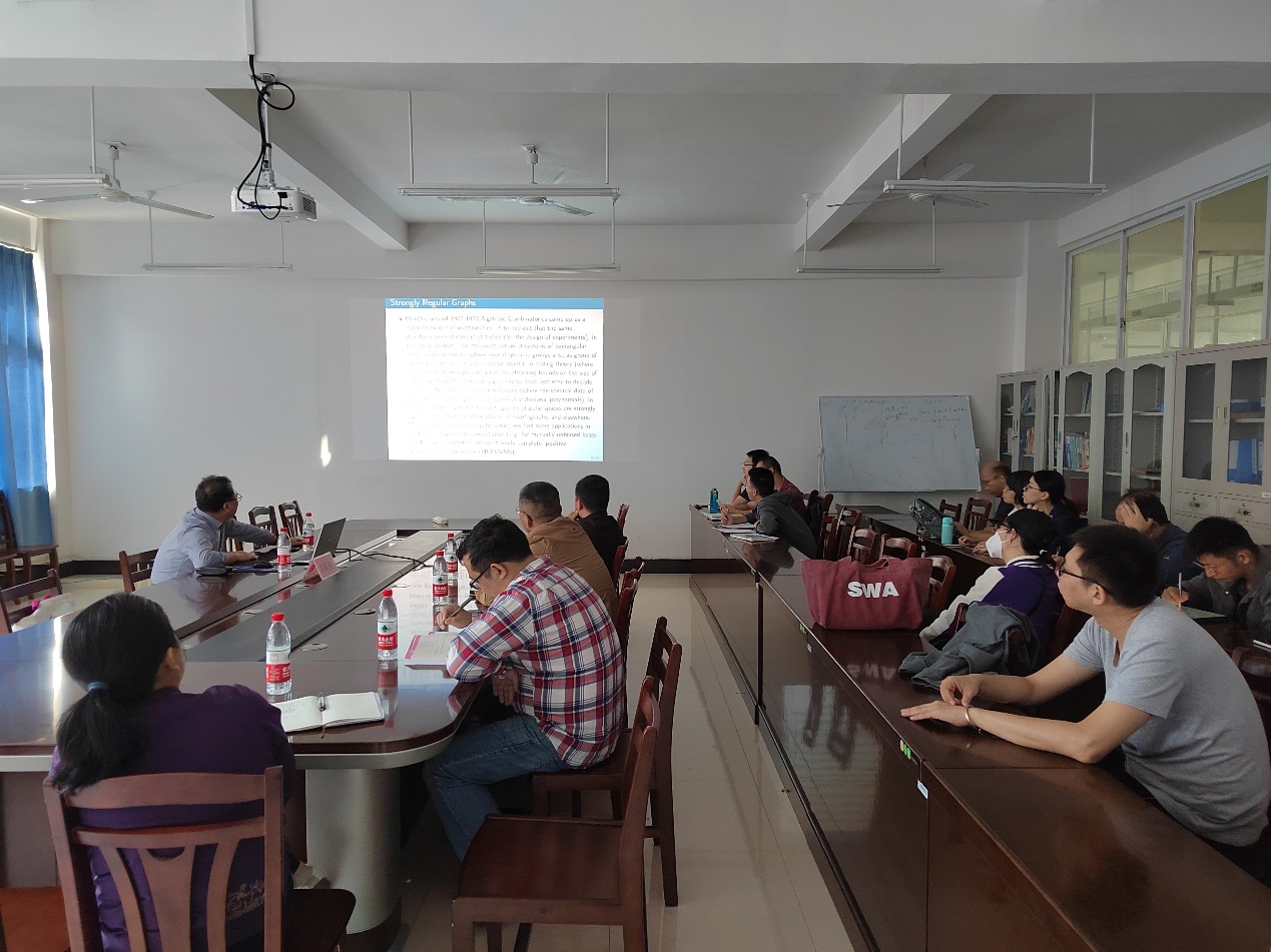 冯教授从图论的基本概念讲起,详细介绍了强正则图的发展与演化,以及在相关领域中的应用。冯教授通过梳理已有强正则图的研究结果,从两个方面对强正则图给出了推广,并介绍了数学的推导过程。冯教授的报告,从基础到学术前沿,从理论到应用领域,包含了强正则图完整的研究过程。他深入浅出的讲解吸引了广大教师的科研兴趣,报告结束后纷纷与他交流、讨论。