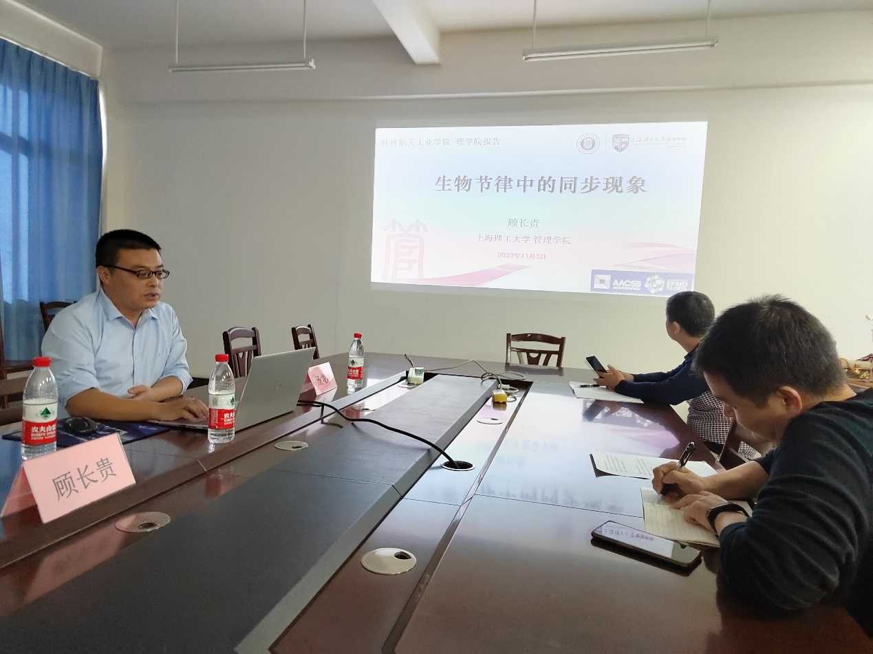顾长贵教授报告的题目是《生物节律的同步现象》。顾教授从自然界的生物钟谈起,介绍了生物节律的同步现象,详细讲述了从弱生物节律到强生物节律的转化方法以及如何保持良好的生物节律。顾教授的报告紧扣学术研究前沿,方法新、逻辑性强、讲解幽默风趣,引来学院教师与之交流、探讨。此外,顾教授还就系统科学学科建设与我院教师进行了交流。
