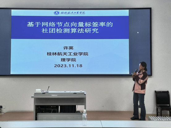 我院许英副教授应邀以《基于网络节点向量标签率的社团检测算法研究》为题作学术报告,许老师从“一个社会网络的例子”展开分享。她以生动具体的案例设计、丰富多彩的图片,详实地介绍了各类社团检测算法,展示了设计新颖、富有创意,集数学特色与学科融合于一体的创新型数学的精彩报告,得到了现场专家和老师们的一致好评。