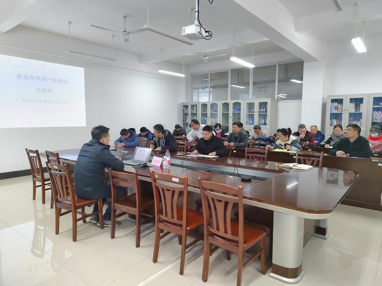 12月28日,理学院在巡天楼404会议室召开了国家自然科学基金申报辅导报告会。会议邀请了广西师范大学数学与统计学院院长张映辉教授,就国家自然科学基金申报做专题辅导报告。学院全体教师参加报告会。报告会由吴果林副院长主持。