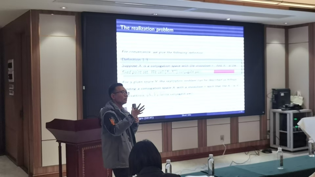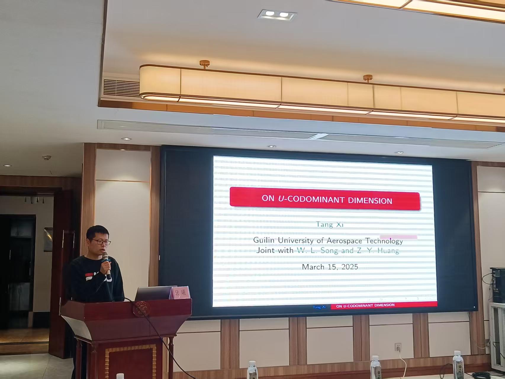在学术与教学交流环节,来自广西师范大学、桂林理工大学、桂林电子科技大学以及桂林航天工业学院的多名老师做了学术报告,吴果林副院长主持了一个分场学术报告。我院唐曦教授做了“On U-codominant dimension”的学术报告,介绍了由Tachikawa在研究 QF-3代数时引进的控制维数的概念以及控制维数与著名的Nakayama猜想的密切联系,从范畴对偶的角度重点分享了U-余控制维数的对称性问题;刘登品博士做了“环面流形共轭空间的实现”的学术报告,分享其在环面拓扑流形范畴内,知道每一个2n-维拟环面流形都有一个n-维小覆盖与之成为共轭对,怎么求解逆问题的计算以及结论。
