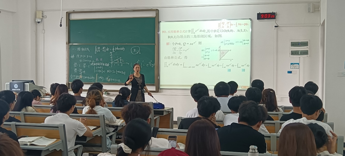课程伊始,耿秀荣教授以剑桥大学冈维尔与凯斯学院纪念窗中的格林定理为切入点,巧妙引入主题,瞬间吸引了在场师生的注意力。耿教授详细阐述了格林公式在电磁学领域的应用,深入浅出地讲解了相关理论知识,并结合实际案例进行分析,将复杂的学术内容化繁为简,让在场师生易于理解。在讲解过程中,耿秀荣教授还穿插了许多生动的图片,进一步增强了课程的趣味性和吸引力。本次公开课还设置了学生练习的板书演示互动环节。耿秀荣教授对学生的书写进行了细致的点评,取得了良好的课堂教学效果。