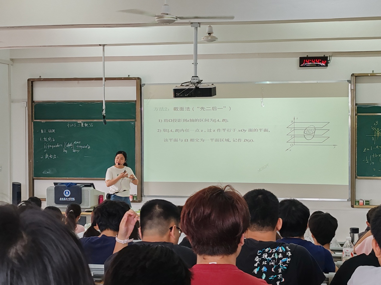课堂上,洪老师以生动形象的方式引入三重积分计算的原理并给出了三重积分的计算方法。在讲解三重积分的计算方法时,洪老师运用多媒体技术,结合PPT图形演示,将复杂的空间区域划分和积分过程直观地呈现给学生。她逐步推导公式,详细解释每一个步骤,并不时与学生进行互动,且布置课堂练习随时观察学生的掌握情况。课堂上学生们积极参与讨论,氛围十分活跃。