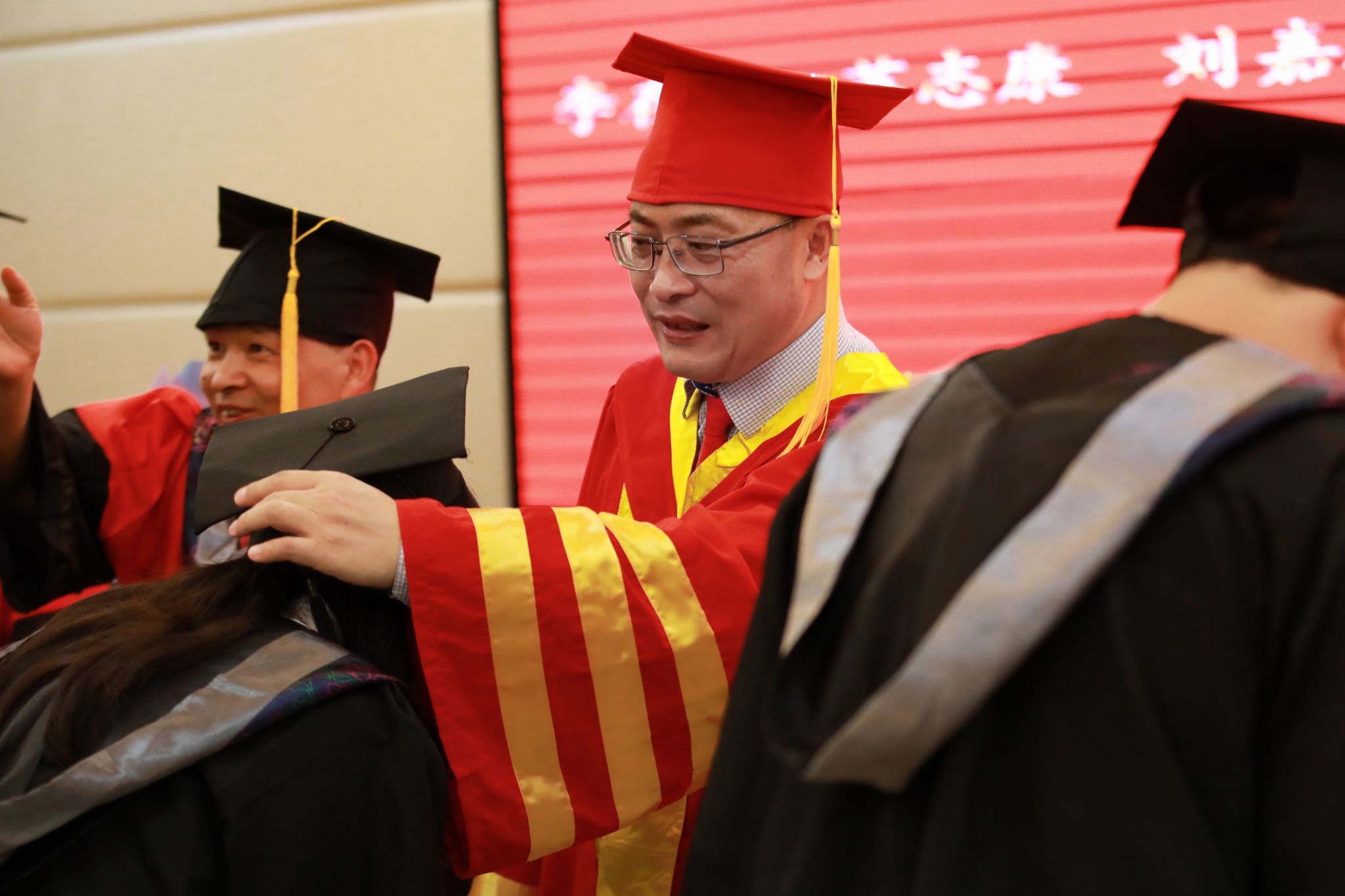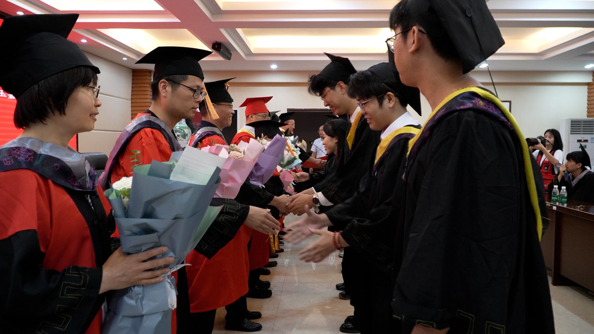 随后,主持人宣读学位授予文件,全场响起热烈掌声。在学位授予环节,两个学院学位委员会成员为毕业生代表正冠拨穗、颁发学位证书。