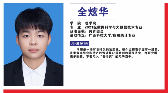 在桂航bevictor伟德官网众多学子中,全炫华同学或许并非最耀眼的那一个。他没有耀眼的竞赛奖项,也没有堆叠的荣誉证书,英语水平仅通过四级,这些似乎都并非考研征途上的“加分项”。然而,正是这样一位看似平凡的学生,凭借着内心的坚定与脚踏实地的努力,在2025年研究生考试中成功“上岸”,被广西科技大学的应用统计专业录取,为自己的本科生涯画上句号。
