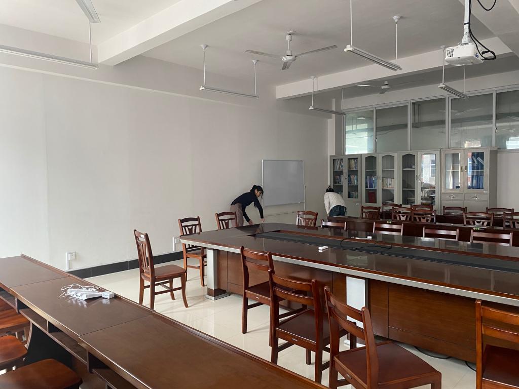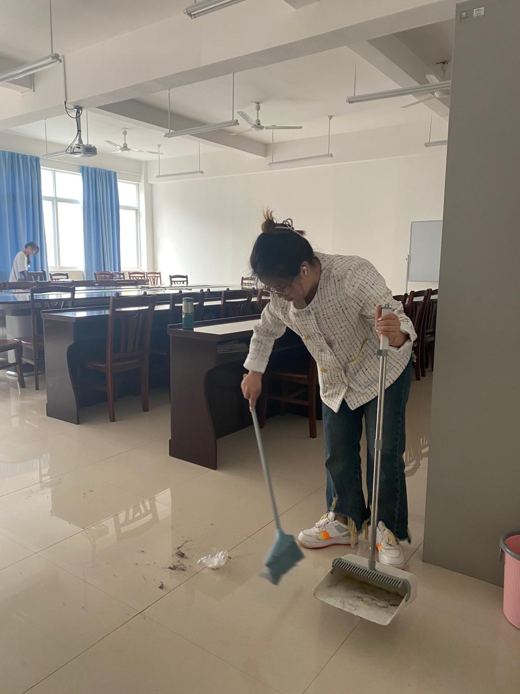 当天上午,同学们与活动负责人准时抵达集合地点。活动负责人分发清洁任务,合理安排每个人的工作,并告知同学们相关注意事项。活动开始后,每位同学怀着饱满的热情和积极向上的态度投入到此次活动中。同学们用抹布擦干净桌面上的污渍,并找来了笤帚与簸箕,将地面上的垃圾清理干净,把桌椅摆放整齐,高效率的完成了此次打扫任务。